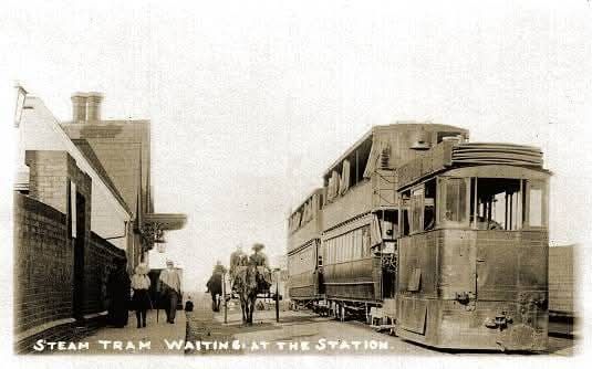 Another view of the steam tram waiting at Wolverton Railway Station. As these two images show, the passenger facilities were accessed at road level from the bridge over the main line railway, © Public Domain. [23]