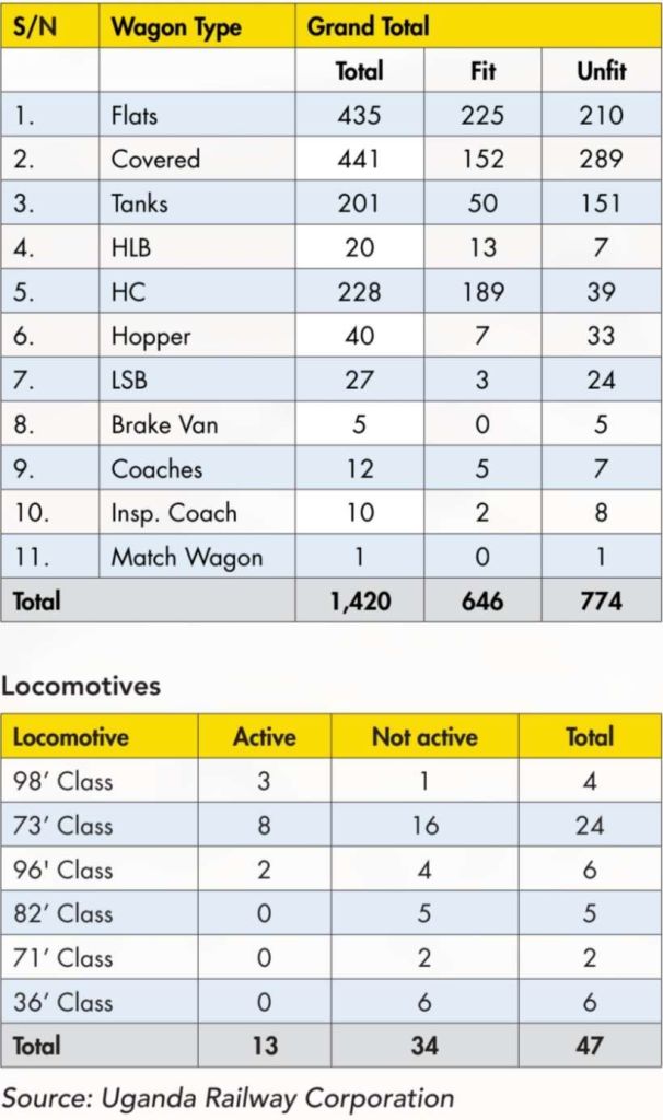 The Strategic Plan itemises the rolling stock that it owns – a total of 1,420 wagons of different types including flatbeds, tanks, covered wagons among others, and spread across the entire network (including Kenya and Tanzania). However, it says, the URC still faces