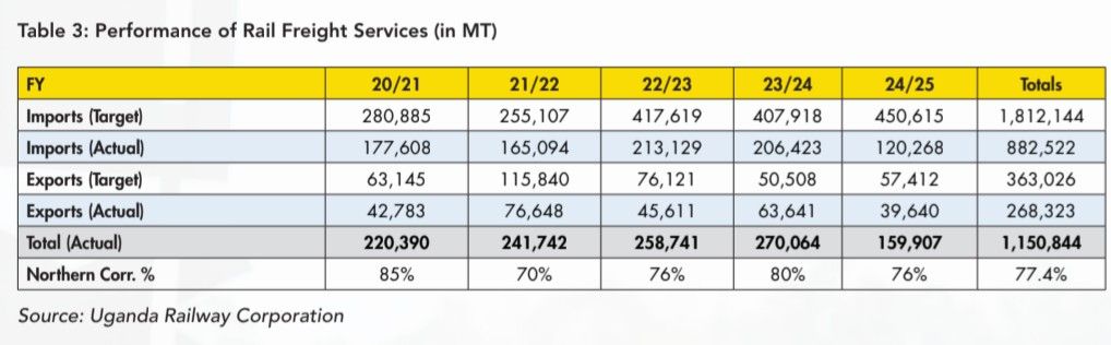 Table 3 shows that during the period July 2020 – December 2024, the URC network carried a total of 1,150,844 MT against a target of 2,175,170 MT, that is 53%. Of this, 77% were imports while 23% were exports.