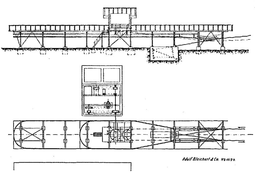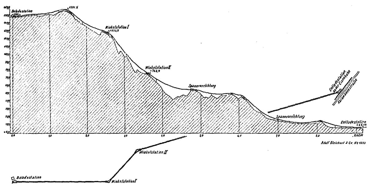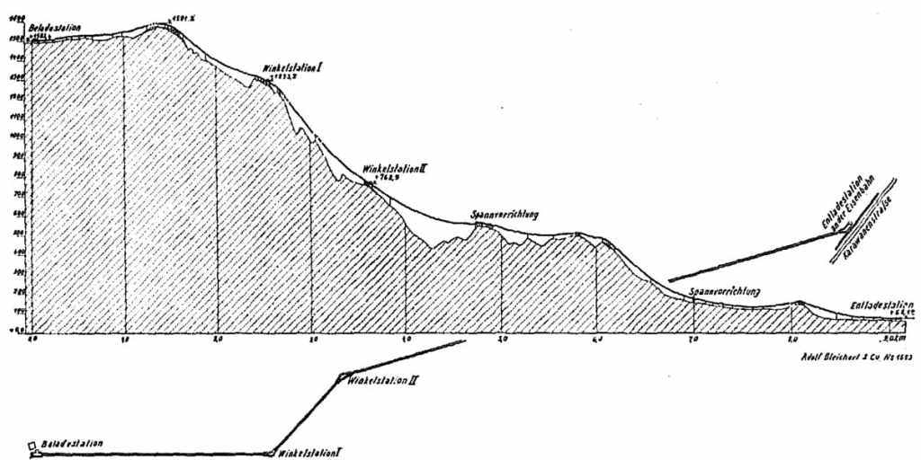 The ropeway was constructed by Adolf Bleichert & Co. a German company primarily active in  cableway construction . It was founded in 1876 by Adolf Bleichert and was headquartered in Leipzig – Gohlis from 1881. [2] More information about Adolf Bleichert & Co. can be found here. [3]