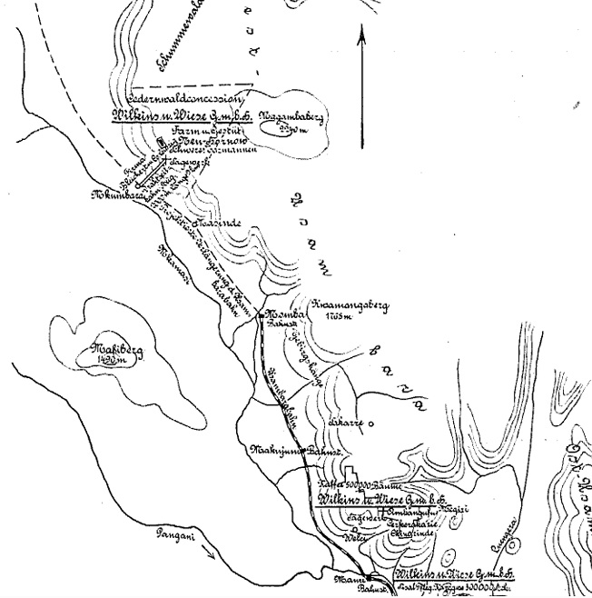 Wilkens & Wiese were aware, when negotiating with the German authorities for a concession to harvest timber saplings in the western Usambara hills and particularly the Schumewald forest, of the difficulty of connecting the steep high plateau with the railway in the plain. A railway or road would have been completely out of the question due to the sharp, steep, and heavily forested slopes of the hills. The only option available to them was a cableway to connect the high plateau with the then-planned station of Mkumbara on the Usambara Railway. In anticipation of the expected difficulties, the cableway was ordered from Adolf Bleichert & Co. in Leipzig-Gohlis andwork commenced in the spring of 1910. The location of the cable car and the timber concession of Wilkins & Wiese are shown below: [4: p17]