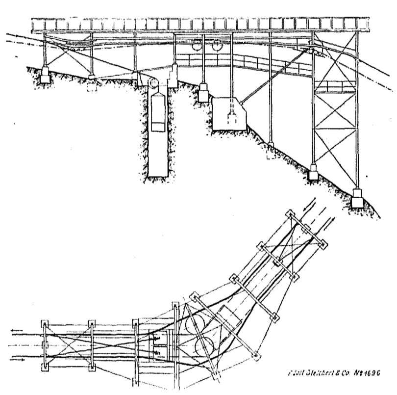 Over the longer spans, the haul rope had to be guided as far away as possible from the track rope to prevent entanglement in the track rope. Based on these considerations, a support design generally emerged that deviated from the normal design due to the large distance between the haul rope guide and the support shoe.