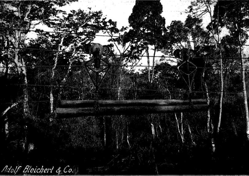 A 9 km long ropeway was constructed, under the ownership of “the firm of Wilkens and Wiese, and designed to carry cedar from the Shume plateau to the railway, an enterprise that was never an economic success. The longest span of the ropeway, 907 metres, was said to be the longest in the world when it was built in the years 1910-1911.” [1: p75] Wood was transported via the Goatal/Ngoha Valley in the Schumewald/Shume Forest. [2]