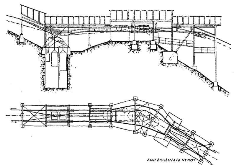 Handbrake operation for the further descent did not seem reliable enough. It was much more practical to also apply the brake regulator installed in Neu-Hornow to the last section of the cableway. Furthermore, for this last section, with its relatively gentle gradient compared to the higher sections, there was a risk that the haul rope would stop if there was a large uphill load and a poorly occupied downhill section. Therefore, at Winkelstation No. 2, the traction cable of the upper two sections is guided around a pulley on the end guide shaft of the lower traction cable run, thus achieving the necessary positive connection. The traction cable of the upper section then passes over an end guide pulley mounted in a tensioning frame and is tensioned by tightening the tensioning lever due to weight distribution. In this station as well, the wagons are manually guided onto the following sections for the reason already mentioned. Winkelstation No. 2 is shown in the photograph immediately below. The coupling points are visible at the entry and exit points. To find space and support points for the installation, costly blasting and foundation work was also necessary here. [4: p28-29]