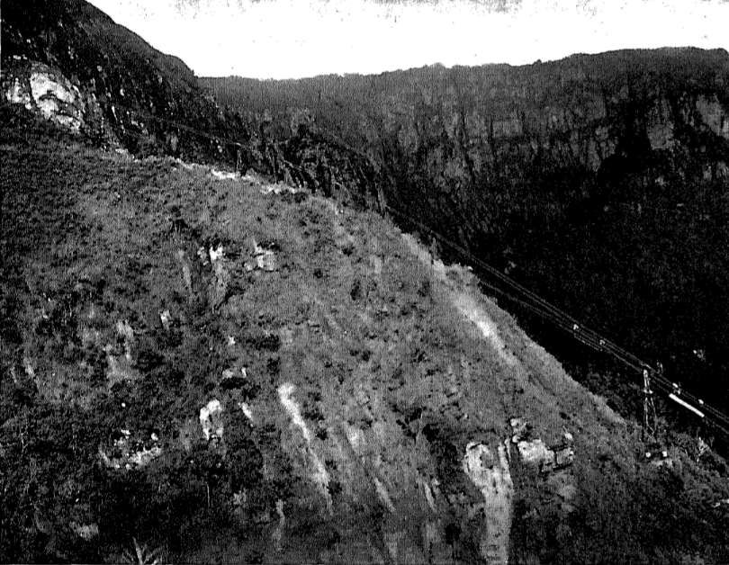 The highest point of the line was at 2011 m above sea level, 1591.2 m above the survey base, was reached 1.2 km from Neu-Hornow, 1523 m above the unloading station. To obtain the most favorable line alignment, a simple cut had to be made at the crossing over the edge of the plateau (shown in the image below). This presented no difficulties due to the firm clay layer, but in light of the heavy tropical downpours, special safety measures for the support foundations were required. For this purpose, the line was laid at an angle and equipped with a lateral drainage ditch. Sloping ditches were also dug in front of the supports to divert the water.  The slope of the ground followed the profile of the cableway and accordingly had a gradient of 1:2. [4: p24]