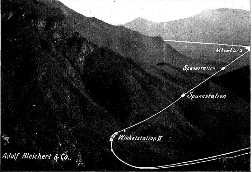 The line began at the loading station near the Neu-Hornow Sawmill at an altitude of approximately 2000 m above sea level. At about 1.2 km from the sawmill, it crosses the edge of the plateau. It then descends quite steeply to an altitude of 1290 m, where it turned through a 45° angle. From here, the cableway had to be routed to a breakpoint, where it turned once again seeking suitable locations for the support towers. The line then continued with two spans of more than 300 metres each to another breakpoint, the junction station at an altitude of 770 metres. Then the cableway heads for Mkumbara, crossing the uniquely beautiful Ngoha Valley with a free span of 100 metres. Prior to reaching the bottom station at an altitude of 68 metres, the railway has a tensioning and anchoring station at 660 metres and a double tensioning station at 170 metres. The journey of a load takes about one hour.