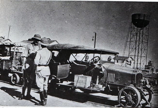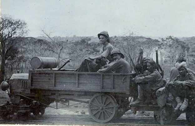 The Railway Companies did well on Segera Hill, getting up to a machine gun, killing the German NCO in charge and capturing the gun in a bayonet assault. The German force withdrew hurriedly but counterattacked next day. The companies were up to their new task and broke the enemy assault. Lt Col Wilkinson now moved across country to deal with an enemy force at Hale, found that it had withdrawn to Kwa Mugwe, moved there and drove the enemy rear-guard away and then repelled another German counter-attack on 19th July. In these operations the machine guns of the accompanying Jind Infantry gave the Railway Companies the supporting firepower that they needed. The companies then returned to their railway duties, having taken a few casualties but doubtless with many war stories to tell. On 18th August Tanga was reached and the port and railway came into use for moving supplies from Kilindini to Korogwe where another 60-centimetre trolley line was constructed towards Handeni. The materials for this line came from abandoned German farms and plantations and the locomotion came from adapted Ford cars used as tractors and operated by the East Africa Motor Transport Corps.
