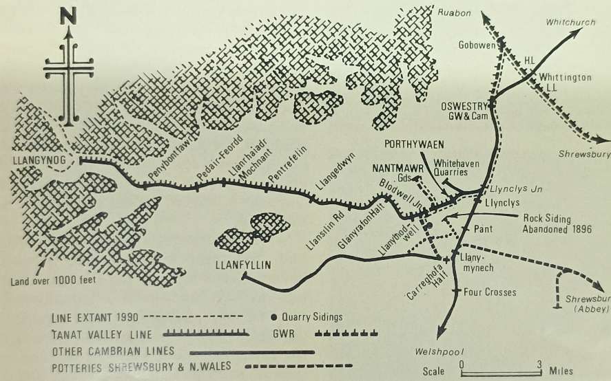 He continues: “The second portion of line to be constructed was the Oswestry & Newtown Railway, which was incorporated in 1855. to link these two towns. The section between Oswestry and Pool Quay opened on 1st May 1860 with the remainder to Newtown opening on 14th August. … The company, which was to be the foundation of the later Cambrian Railways, opened a 1.25-mile freight-only branch from Llynclys Junction, some 3.5 miles south of Oswestry, to Porthywaen. This branch served important quarries, some of which are still operating today, and became the railhead for the industries of the Upper Tanat Valley, Shortly after the Porthywaen branch was opened, a mineral line was built from it to serve some collieries at Trefonen. These collieries however were not very successful and this line was abandoned as early as 1881.” [1: p364]