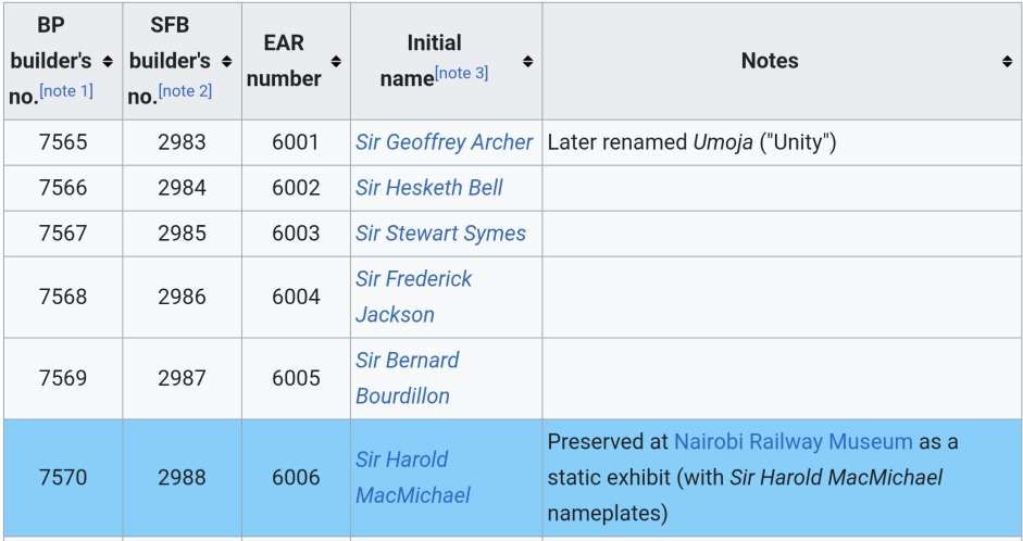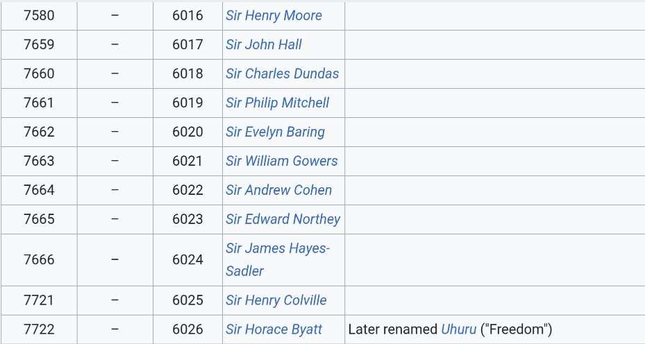 Initially, all members of the class carried the name of a Governor (or equivalent) of Kenya, Tanganyika or Uganda, but later all of the Governor nameplates were removed. [3: p77-78]