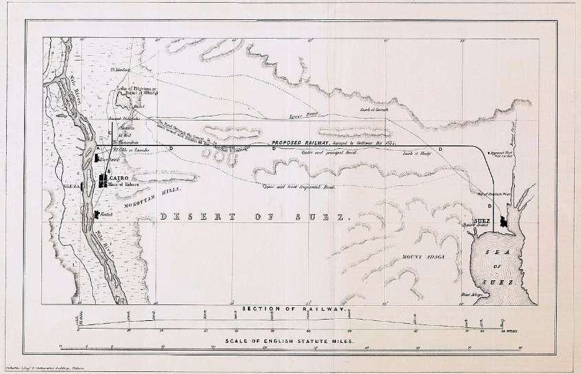 Wikipedia tells us that, “In 1833, Muhammad Ali Pasha considered building a railway between Suez and Cairo to improve transit between Europe and India. Muhammad Ali had proceeded to buy the rail when the project was abandoned due to pressure by the French who had an interest in building a canal instead.” [1] The route of the planned railway is shown in the first image below.