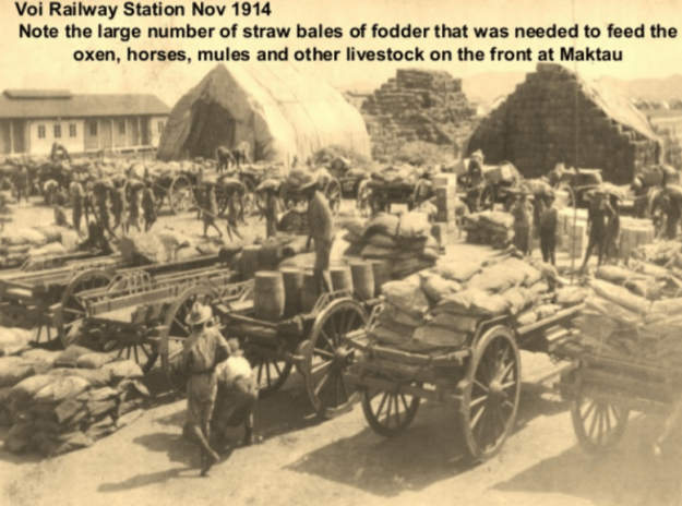 This photograph shows the intense preparations for the campaign in East Africa at Voi Railway Station (c) Public Domain. [4]