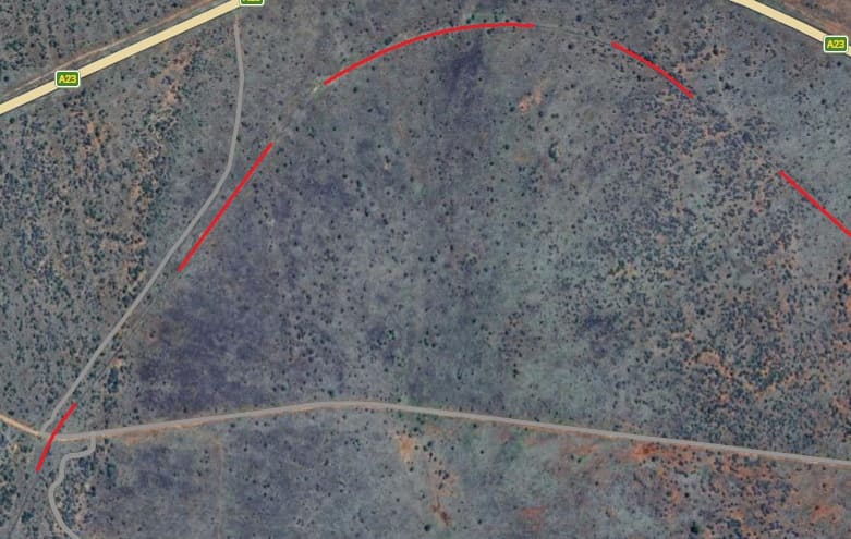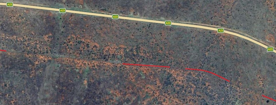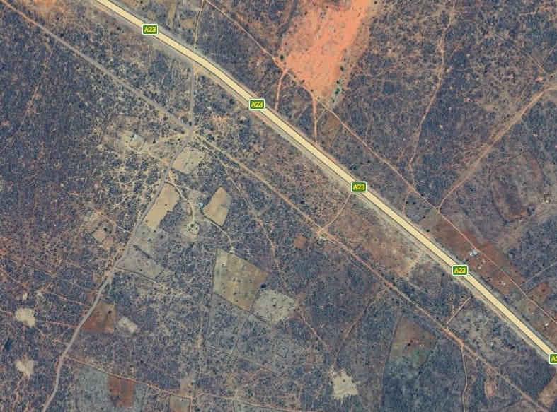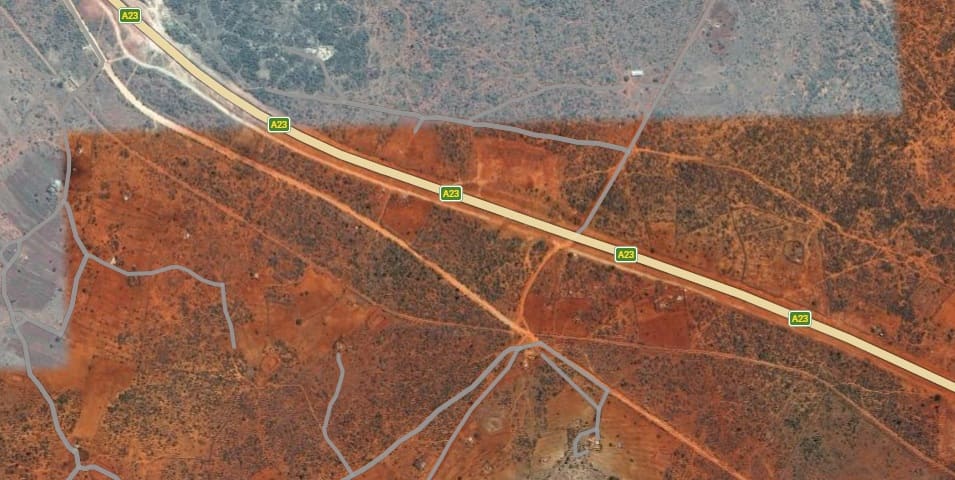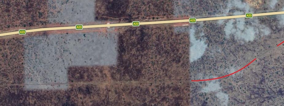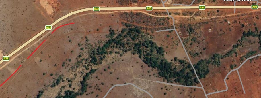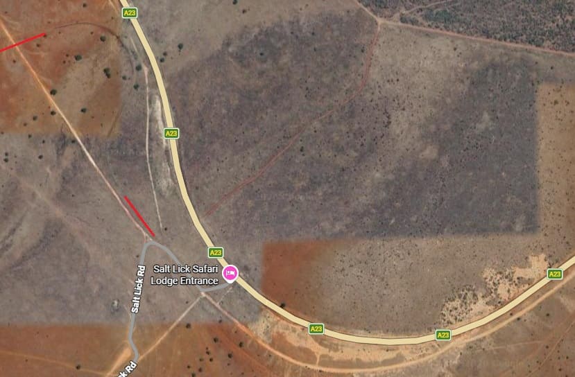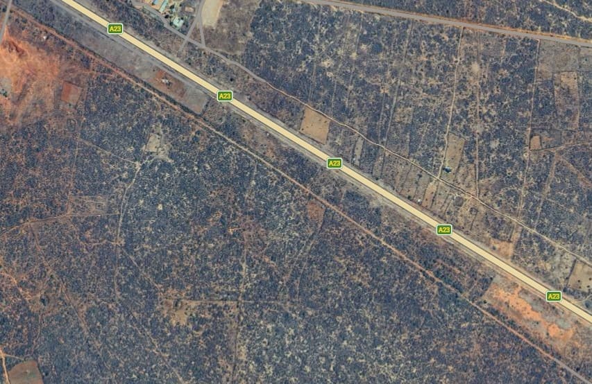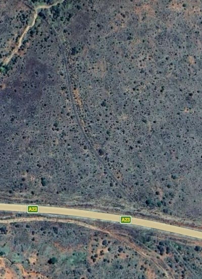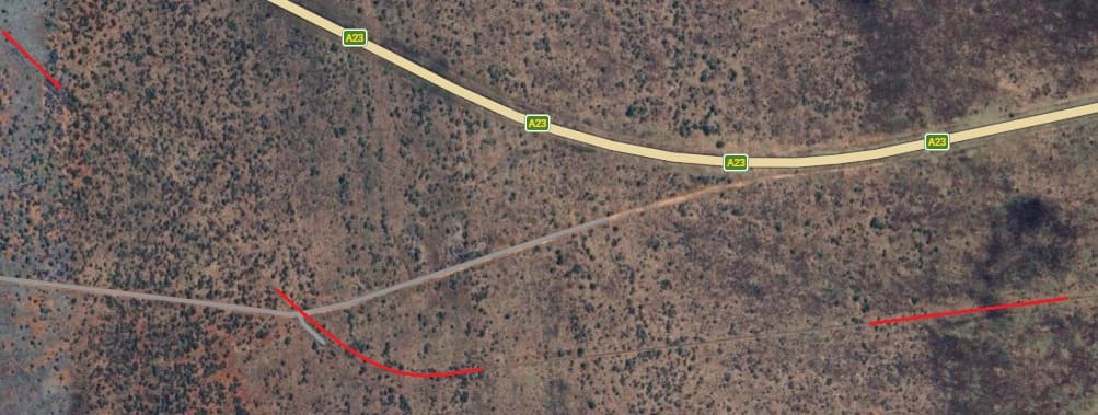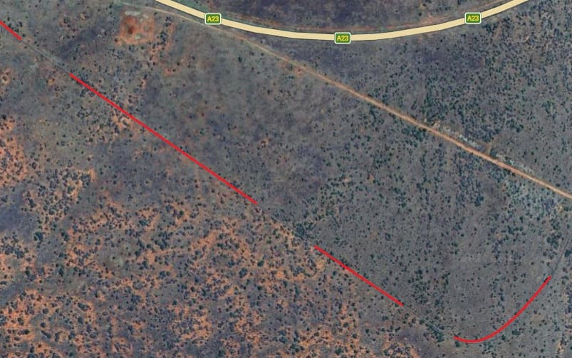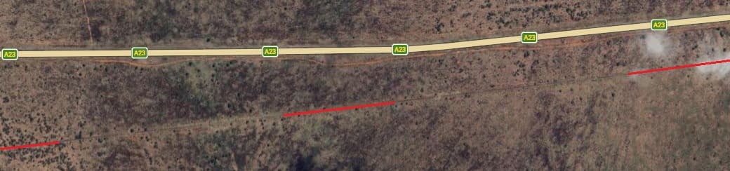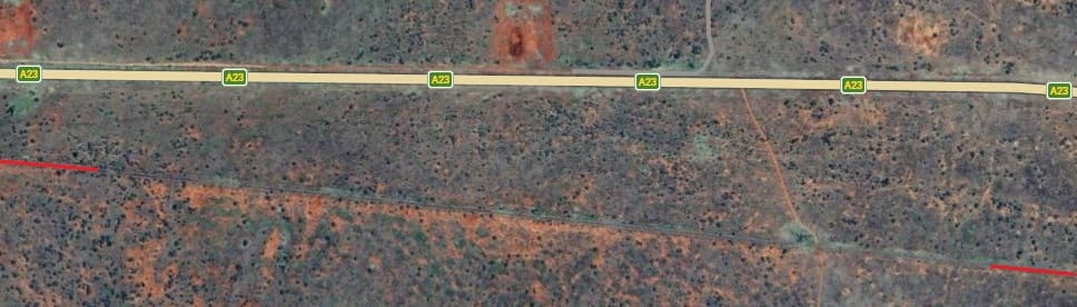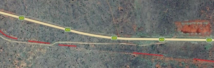 This murram road can be seen at the top-right of the next extract from the satellite imagery. The line can be seen crossing the road in this image from Google Streetview. [Google Streetview, July 2024]