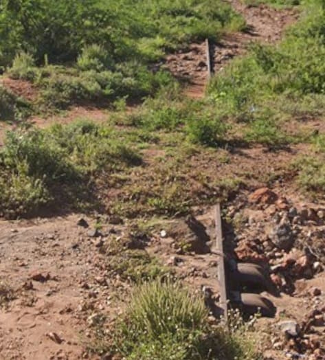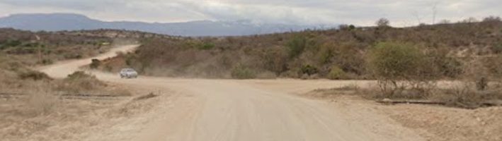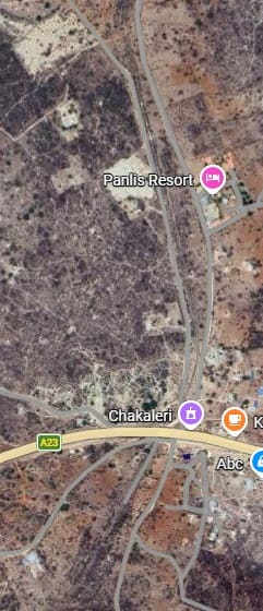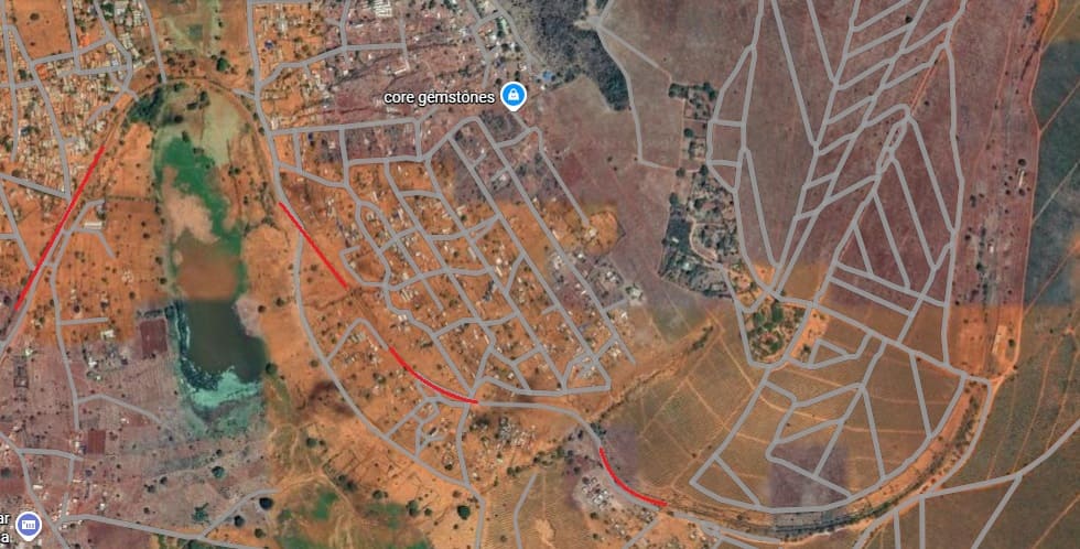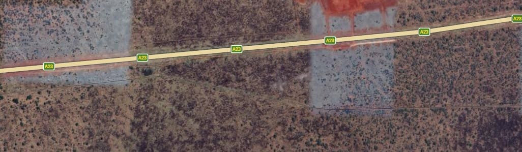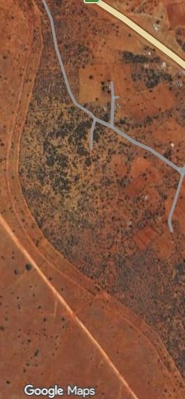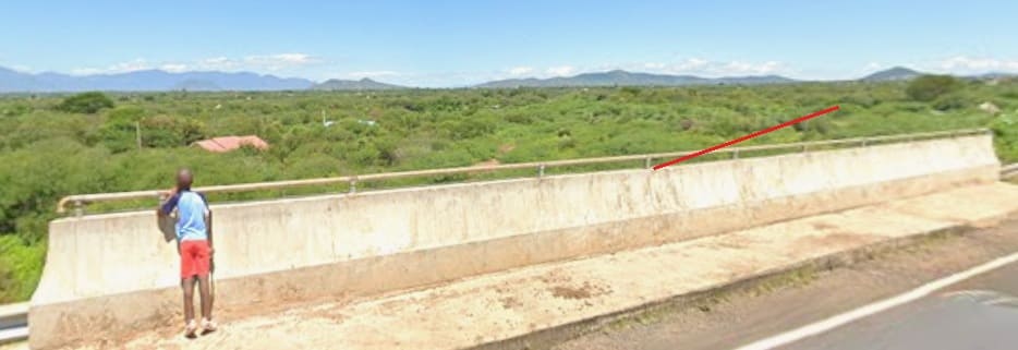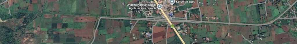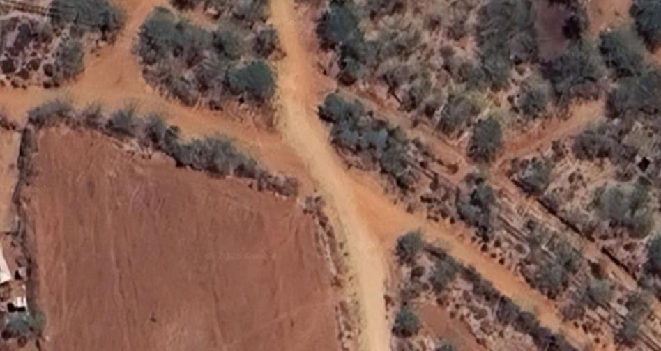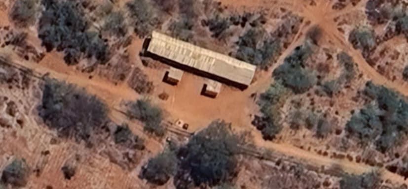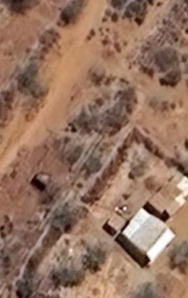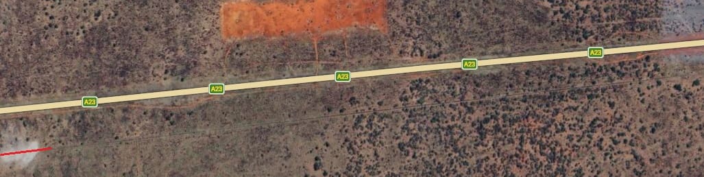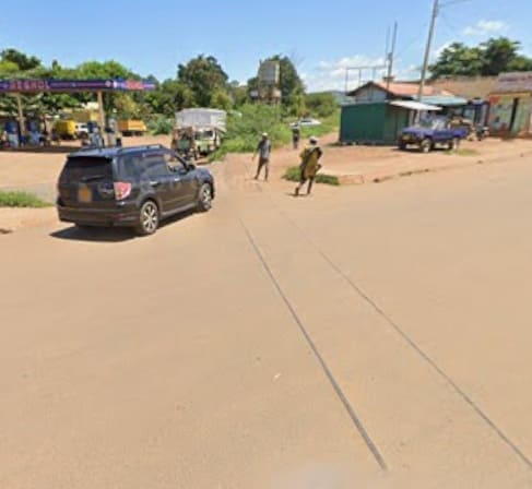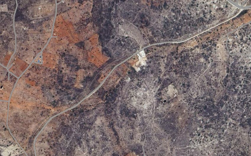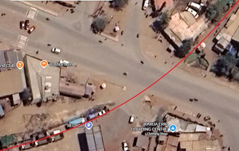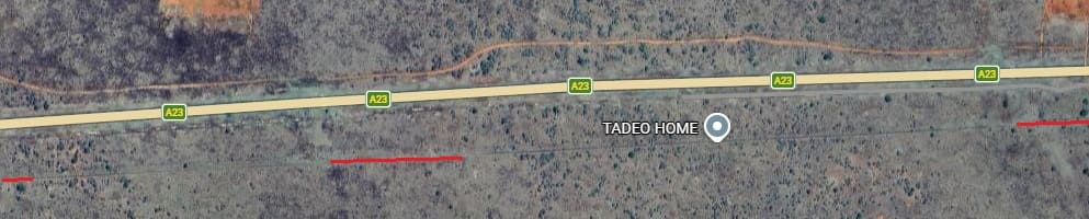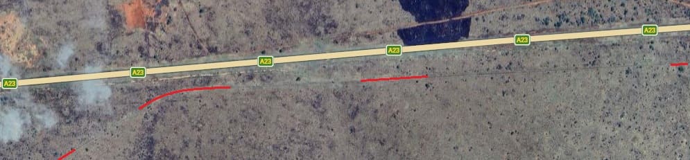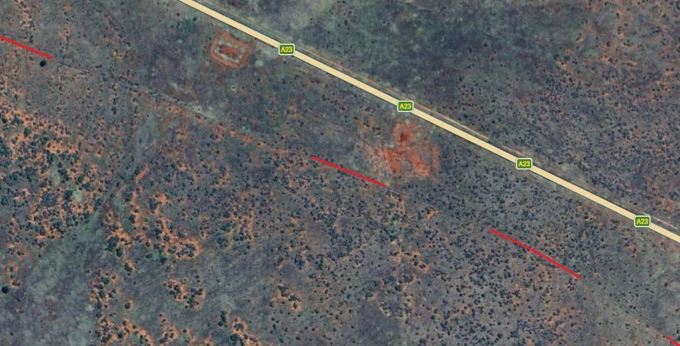 This murram road can be seen at the top-right of the next extract from the satellite imagery. The line can be seen crossing the road in this image from Google Streetview. [Google Streetview, July 2024]