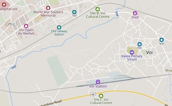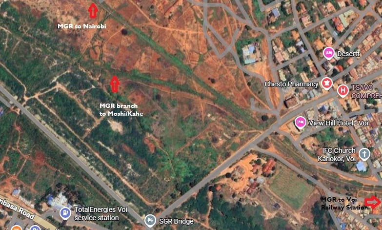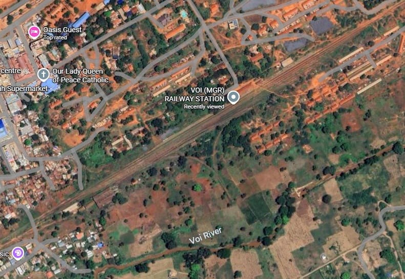 Voi Metre-gauge Railway Station sits on the North side of Voi River. The Standard-gauge Railway station sits to the South. [Google Maps, April 2026]