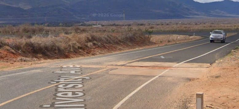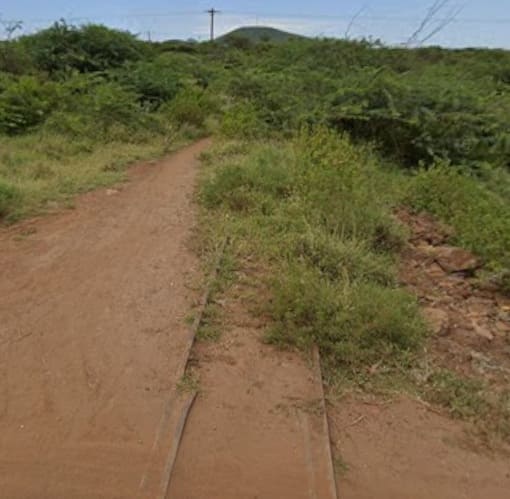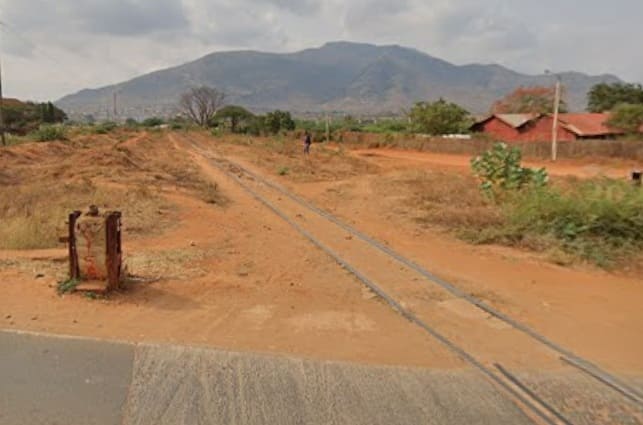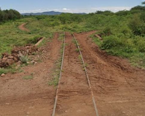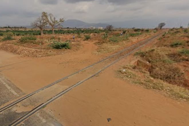 The road crossing at the Northeast end of Taveta Railway Station site. [Google Maps, April 2026]