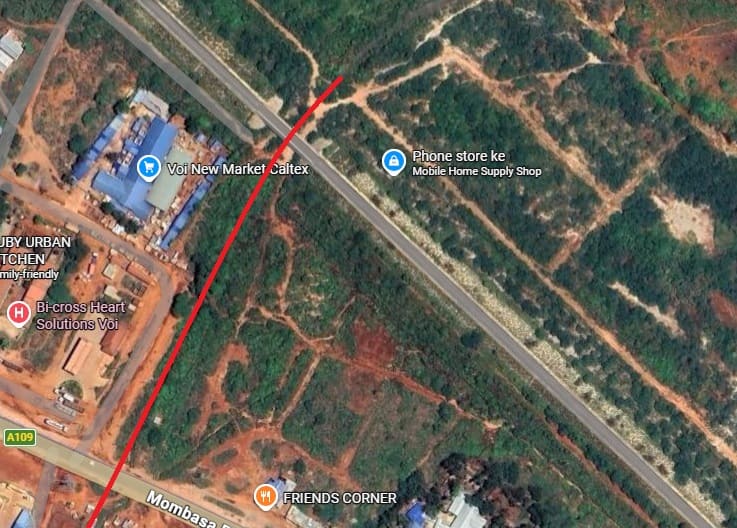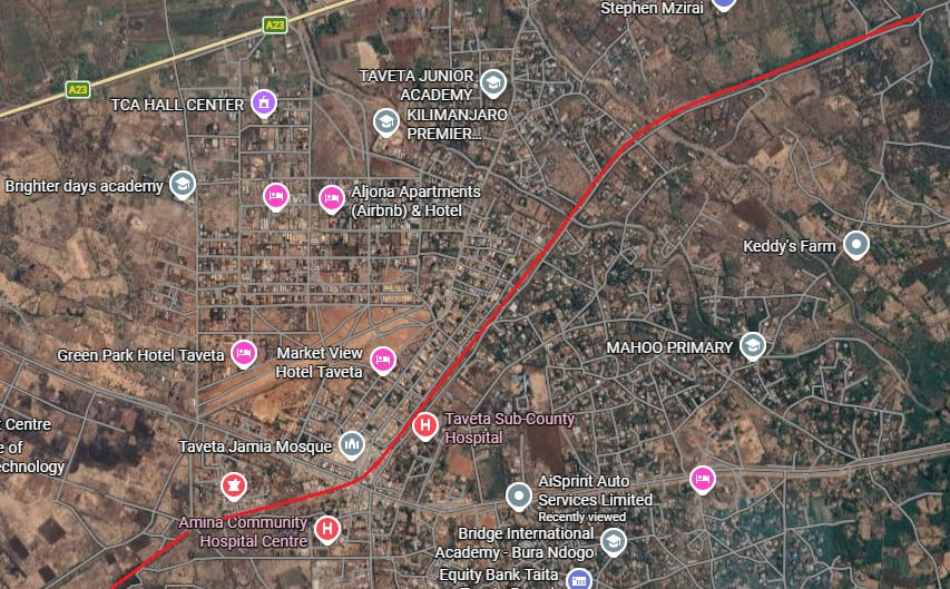The red line shows the route of the old railway through Taveta, [Google Maps, April 2026]