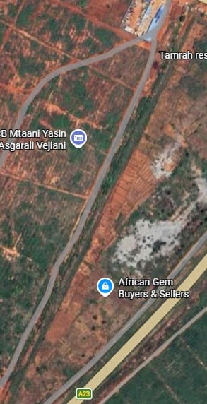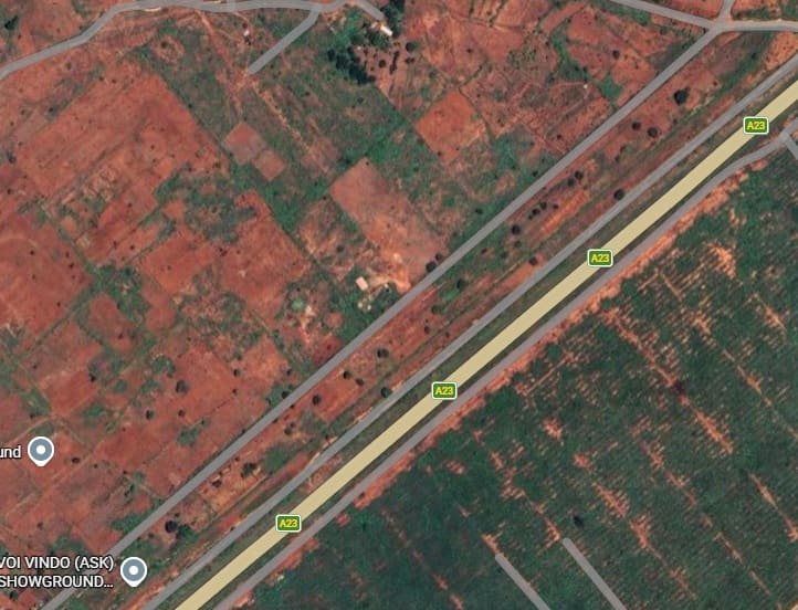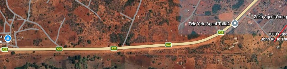 The line and the A23 begin to diverge and the railway crosses a metalled side road close to the A23. The side road is named – Taita-Taveta University Avenue [Google Maps, April 2026]