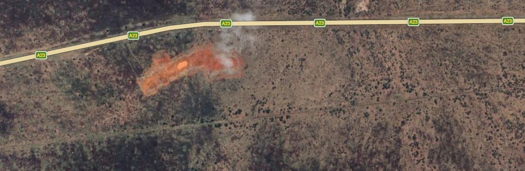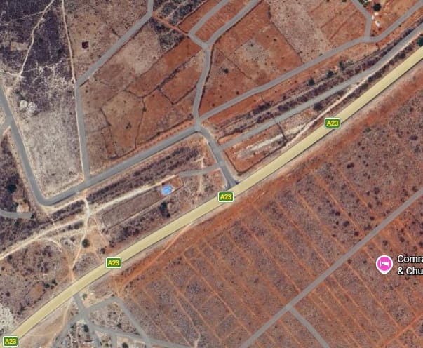 Again, in this next satellite image, the line runs diagonally from top-right to bottom left. The greener lined area in the bottom half of this image will be a sisal plantation. The railway runs between this area and the A23. [Google Maps, April 2026]