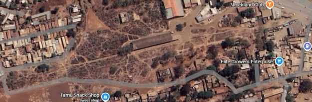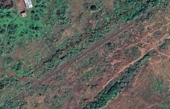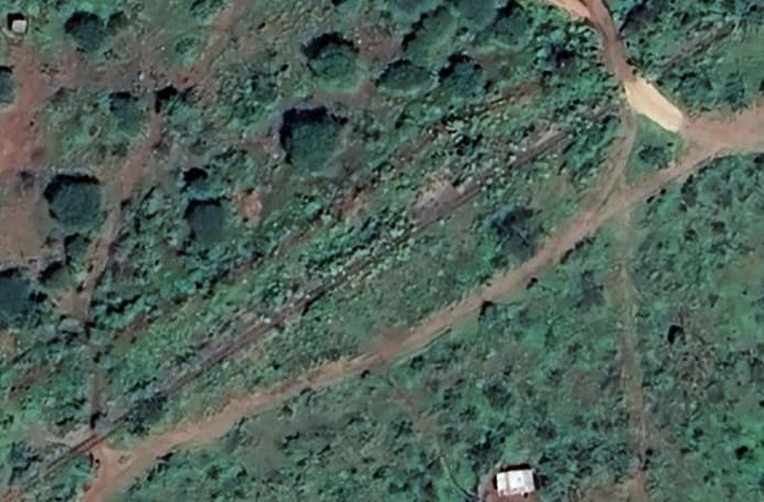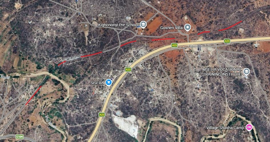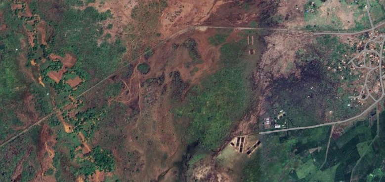 On this next extract from Google’s satellite imagery, the line passes through Mwatate Railway Station on the right side of the image and then wanders sinuously across the image. The intermittent red lines show the route of the line where the image itself, at this scale, is less clear.