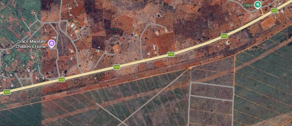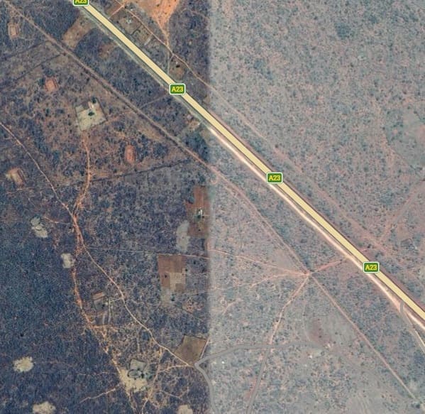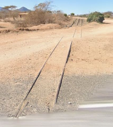 Two photographs taken on the Ziwani-Mtito Andrei road. That on the left looks back East, that below looks West along the line. [Google Streetview, April 2024]