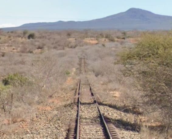 The two images above look along the MGR mainline from the level-crossing. The image on the left looks back towards Voi MGR station, that on the right looks ahead towards Nairobi. The branch line to Moshi/Kahe cannot be picked out on the image on the right as it is hidden by the bushes/grass ahead. [Google Streetview, July 2024]