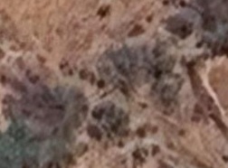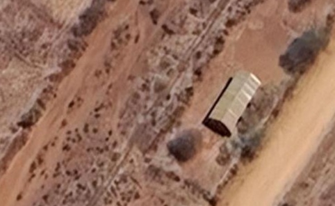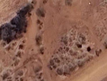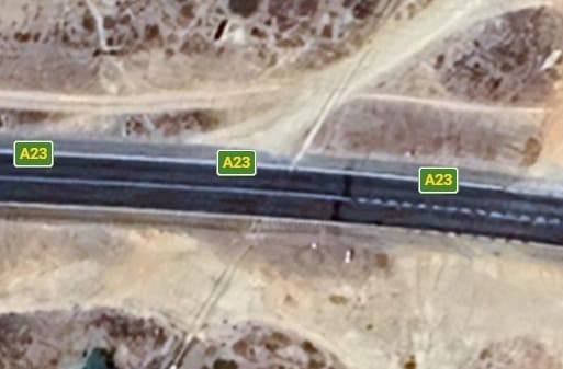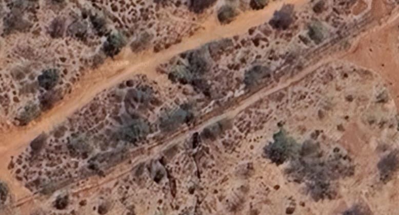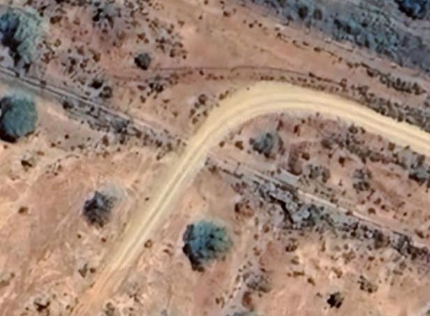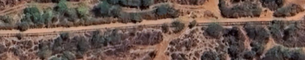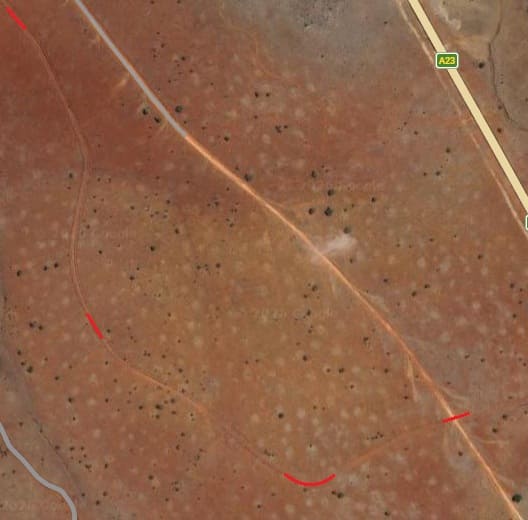 This sequence of extracts from Google’s satellite imagery shows the line running across the map extract above. The first two, on the left and below show the line in the first quarter of the map from the right. The third image is from a location at the third point from the left. The fourth, fifth and sixth images show locations on the left half of the map. [Google Maps, April 2026]