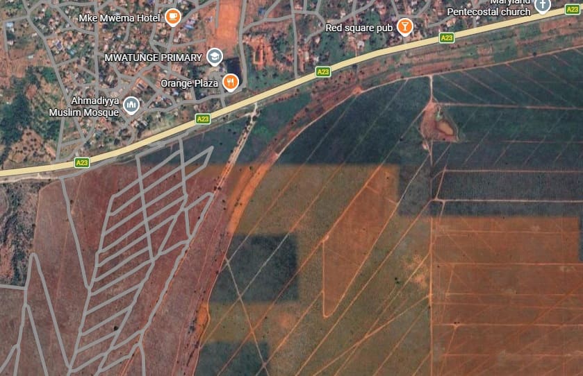Close to Mwatate (which is just off this satellite image to the West (left)), the line turns southwards.