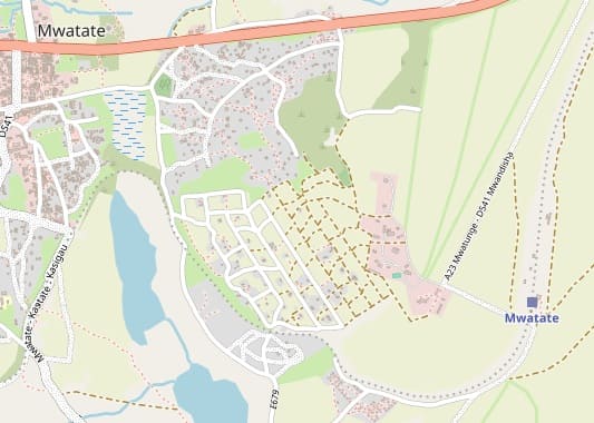 This is a similar area on OpenStreetMap’s mapping. It shows the location of Mwatate Railway station and the town it is named after. The route of the railway is shown as a dotted line. [6] The station is located inside a private sisal farm and not available to the public. [7]