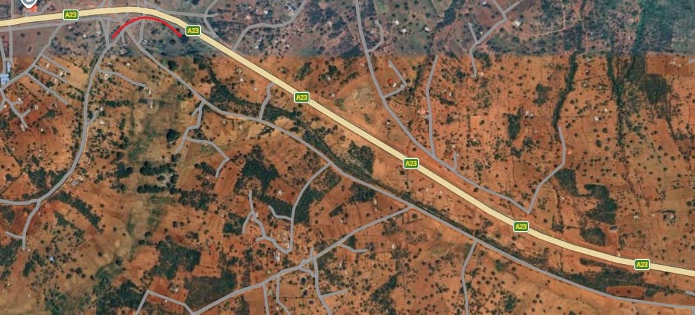 Approximately the same length of the line as appears on the map extract above. The line follows the grey line across the image from the top-right corner along the South side of Ghona, but where the road turns sharply to the South, the lie continues on the same westerly bearing before curving to the Southwest close to the edge of this image. [Google Maps, April 2026]