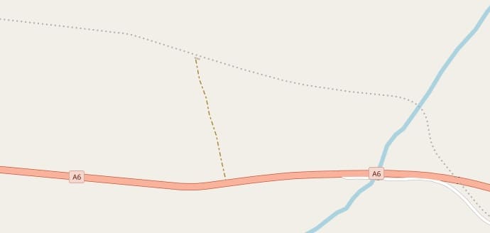 Following on from the last satellite image this next extract shows the line continuing in a generally westerly direction. It continues to seek the easiest route as so curves around following the contours, entering top-right and leaving the image just above the bottom left corner. [Goggle Maps, April 2026]