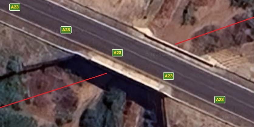 And this is the next length of the line, bearing first to the Northwest, then South-southwest, then Northwest again. The line can be seen crossing the E697 road towards the left of this extract. [17]