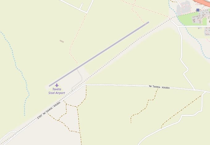This next extract from the mapping of Openstreetmap,com shows the line of the old railway running Southwest from Taveta Railway Station (again shown by the blue square), then to the Southeast of Taveta Sisal Airport. []