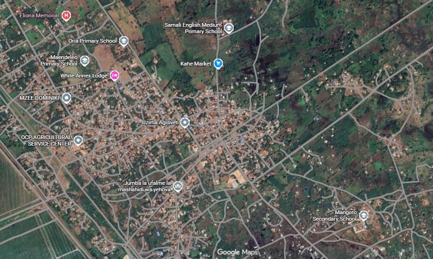 Taveta as shown on Openstreetmap.com. The Railway Station is marked by the blue square. [11]
