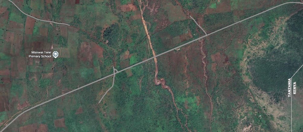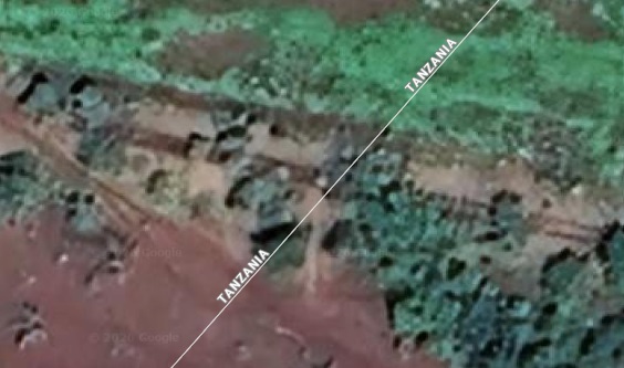 This next extract from Openstreetmap shows the line travelling Southwest and crossing the Kenya/Tanzania border (the pink line), [22]