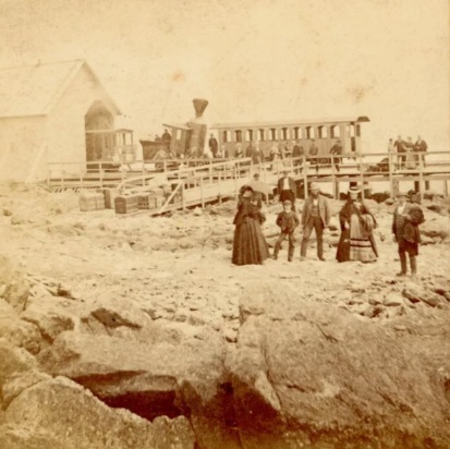 The arrival of a train at the first summit station, circa 1872-1873, (c)Public Domain. This image was shared on THE RAILWAY TO THE MOON! The Mt Washington Cog RY (NH)& Alumni Facebook Group by Conrad Ekstrom on 3rd August 2024, (c) Public Domain. [42]
