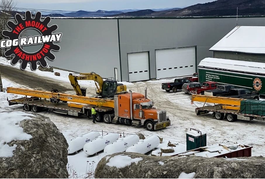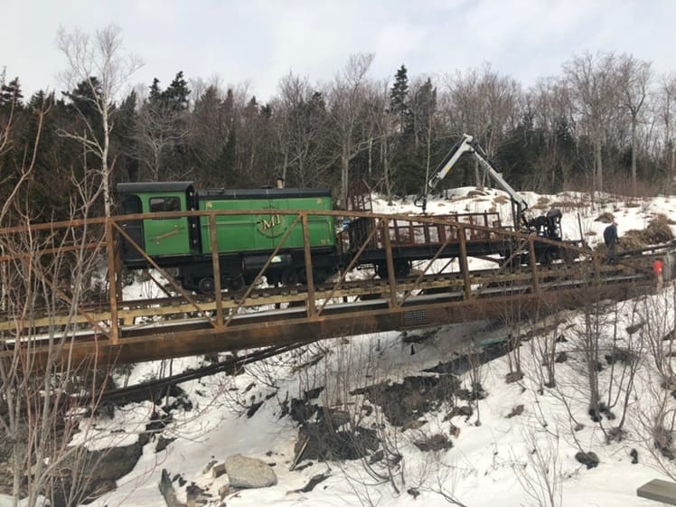 In the autumn of 2017, the railway’s season ended early when flood damage occurred to the old trestle bridge over the Ammonoosuc River. A replacement bridge was ordered on 15th December and installation was completed on 6th March 2018. The bridge, sporting faux trusses, was designed and built off-site by Big R Bridge, based in Greeley, Colorado. It was delivered by truck and set in place by Cote Crane of Auburn, ME. After delivery it only took 3.5 days to assemble and install the bridge. The new bridge spans 107 ft.