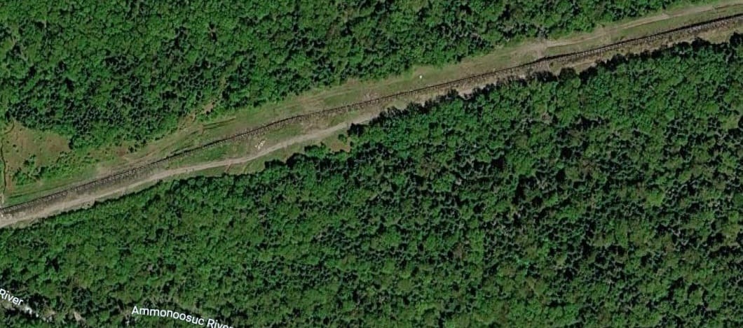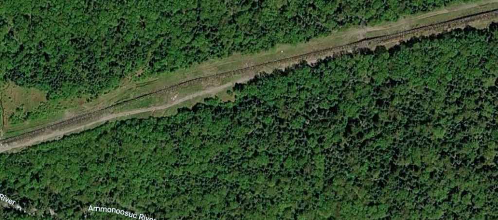 Just beyond Base Station, the Ammonoosuc River is crossed on a simple trestle bridge. After rounding a slight curve a straight stretch of about a mile lies ahead, at the end of which the train will stop for water at the Waumbek tank.