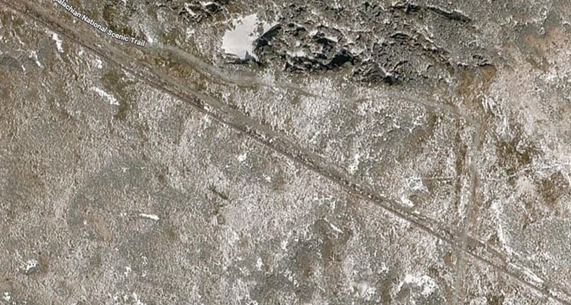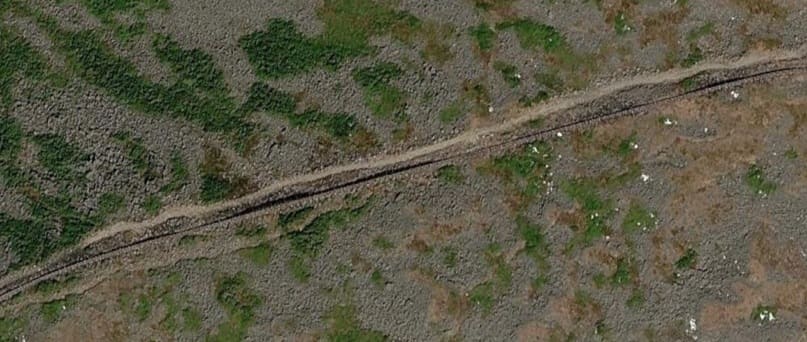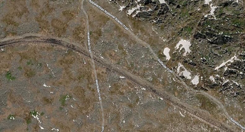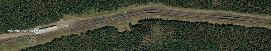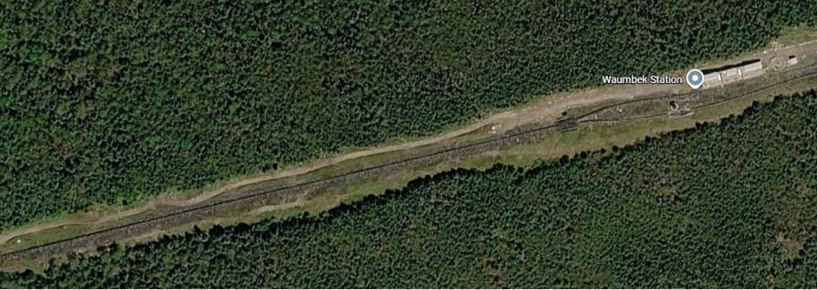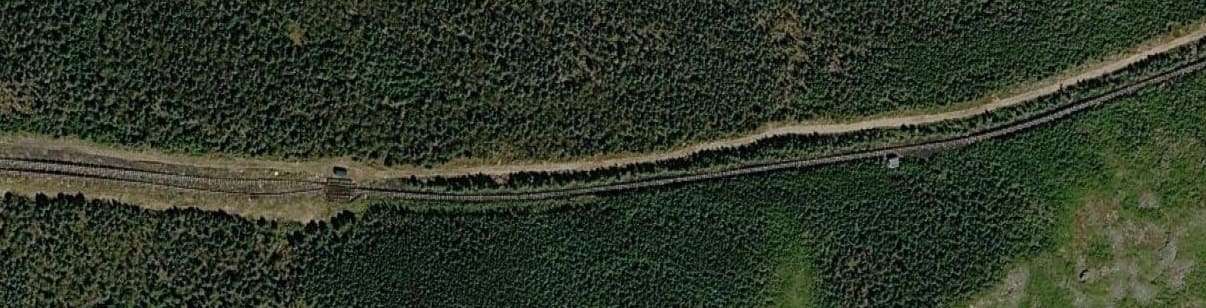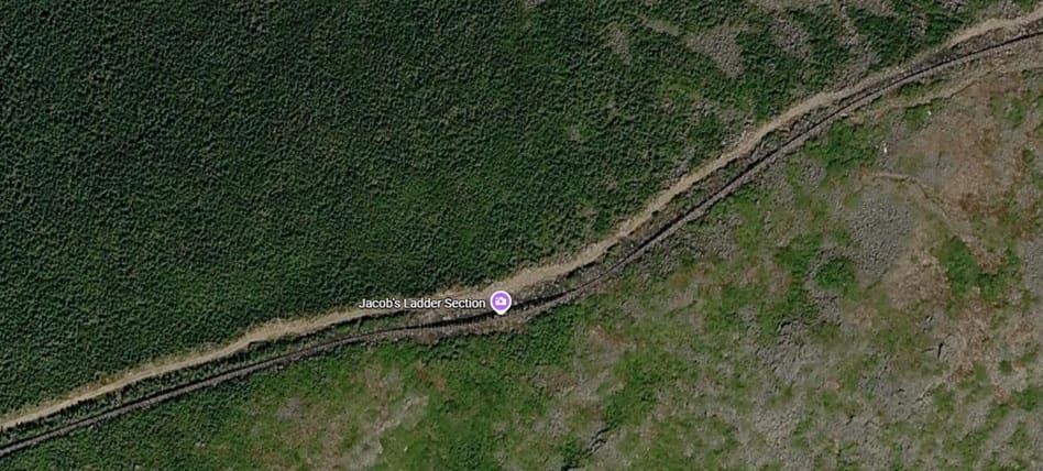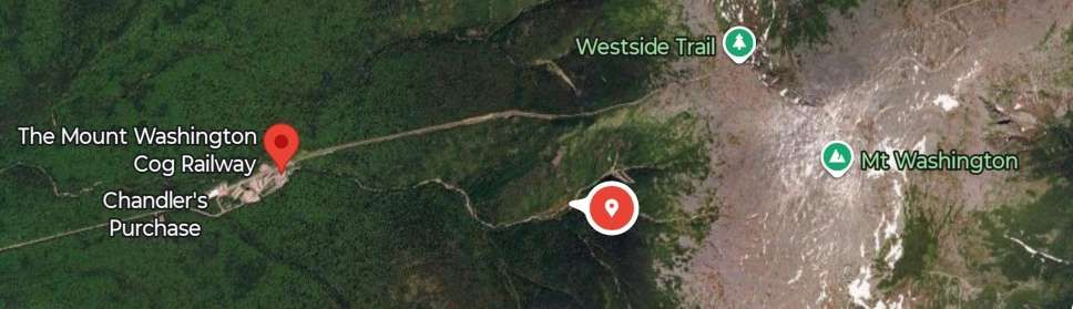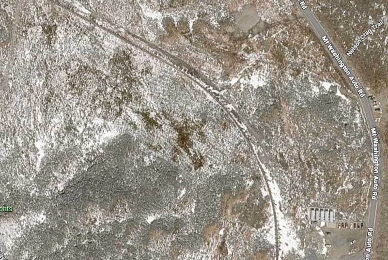 This image shows the view up towards the summit from Waumbek Station on a damp day in the summer. Just to the West of Waumbek Station the single line from the base Station becomes two lines running in parallel. The point at which this occurs can be seen on the left of the satellite image immediately below. [36]
