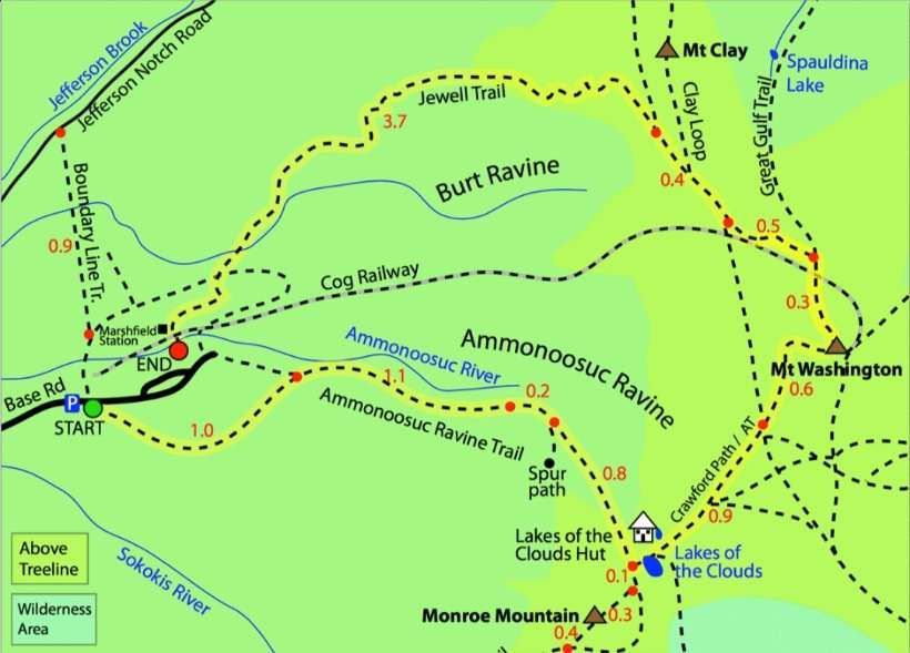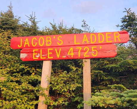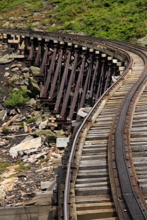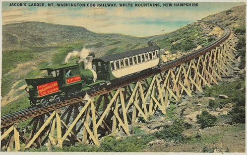 “Marsh’s chosen route for the railway “closely followed a trail blazed nearly 50 years earlier by a young settler named Ethan Allen Crawford. At 4725’, track crews faced the daunting challenge of building a left-curving high trestle to span a boulder strewn gap. Crawford referred to this part of the mountain as ‘Jacob’s Ladder’, and the ambitious new structure would become its namesake.” [38]
