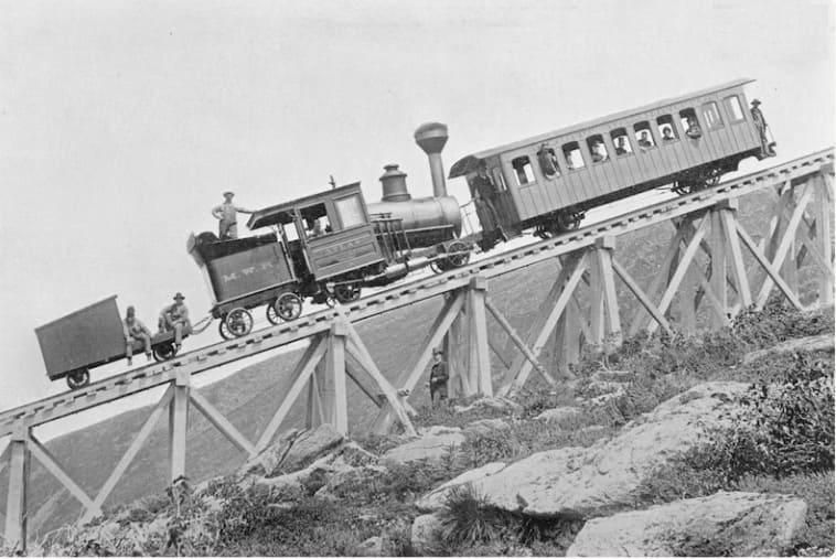 In 1858, industrialist and inventor Sylvester Marsh exhibited a model he thought suitable for climbing mountains “to the New Hampshire Legislature and applied for a charter to build mountain railways. … The charter was granted with permission to build railways to the tops of Mounts Washington and Lafayette.” [1: p787]