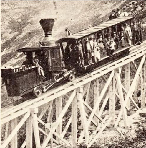 “At nearly 300’ long, 25’ above the surface of the mountain, and ascending at a 37.41% grade, [this trestle] would eventually enter the record books as the steepest and second highest railroad trestle in the world, and by far the steepest portion of Marsh’s railway.” [38]