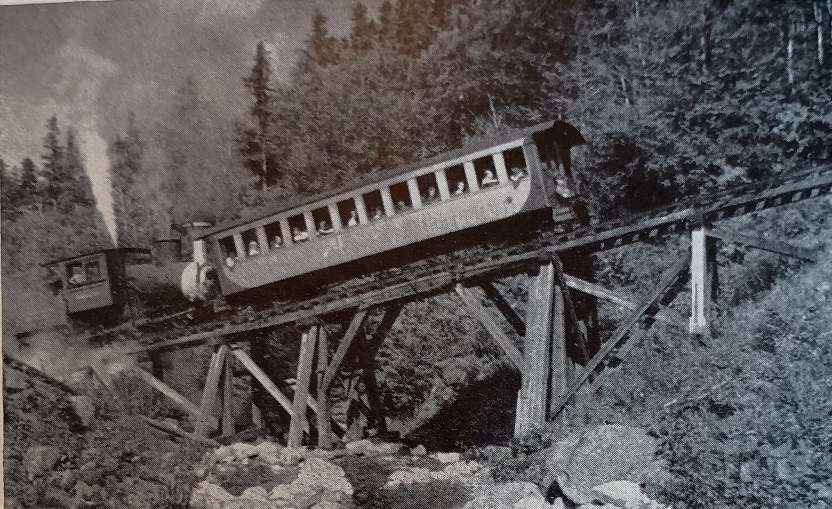 A later view of the trestle in service with a well-loaded passenger coach. This image was shared on THE RAILWAY TO THE MOON! The Mt Washington Cog RY (NH)& Alumni Facebook Group by Chuck Killian on 1st July 2025, (c) Public Domain. [43]