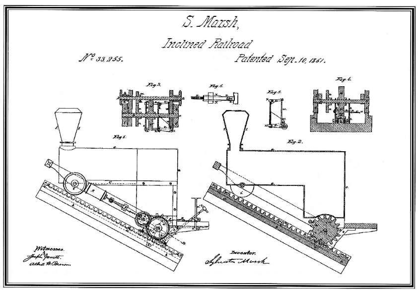 In 1858, picking up on an idea by John Blenkinsop in England twenty years before, Sylvester Marsh applied for US patents for a cog-driven inclined railway. His first patent is dated 10th September 1861, No. 33,255. [21][22]