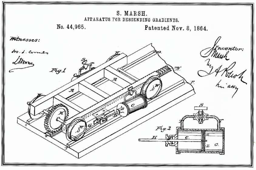 He later, in 1864, applied for and was granted a patent for “an ‘Apparatus for Descending Gradients’ an adjustable, frictionless brake that utilized compressed air to slow a train’s movement, while eliminating the wear and tear on a locomotive’s (and/or carriage’s) wheels.” [23] The patent was No. 44,965, granted on 8th November 1864.