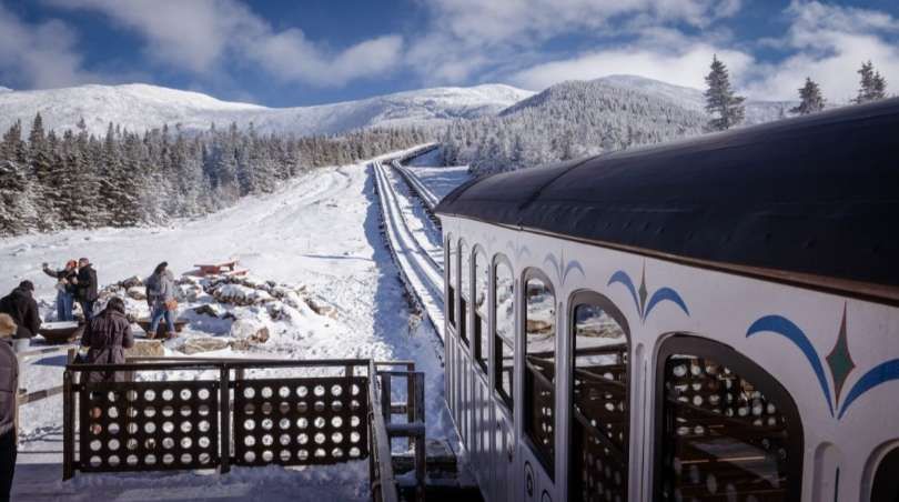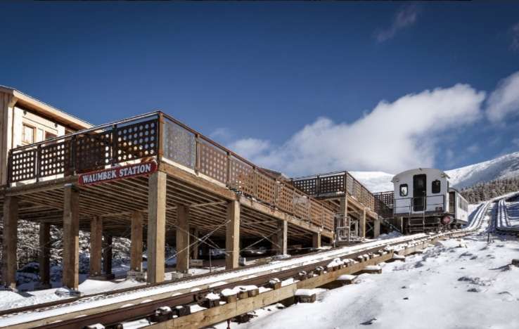 Waumbek Station is a winter destination on the Railway, located at 4,000 feet in an alpine meadow, serving as the terminus of the railway from November to early May. The 1-hour round trip features heated coaches, a 25-minute stop with elevated viewing decks, fire pits, and hot drinks, offering scenic views below the inhospitable summit. [33]
