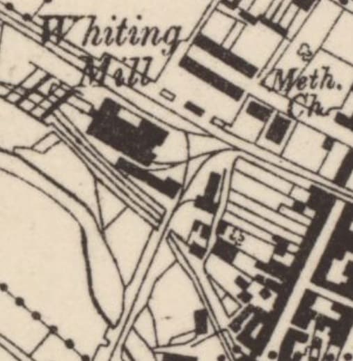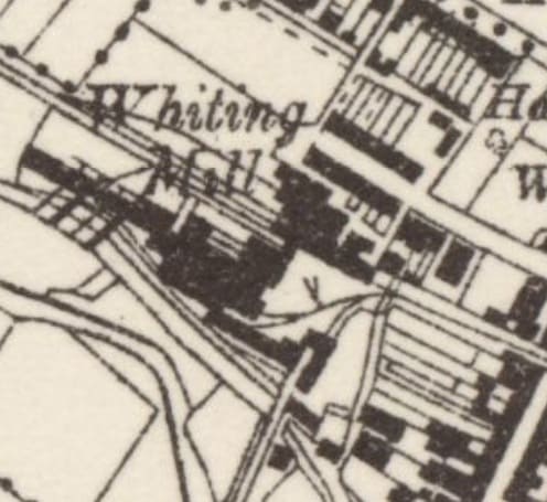 Whiting Mill as shown on the 6″ Ordnance Survey of 1931, published in 1933. Notice that the buildings have been enlarged, that the track layout in the yard is more simple and that the line which used to serve the quarry at Tullyoughter has gone. [12]