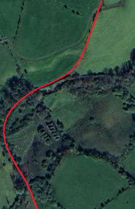 The route of the line is shown on the satellite image on the right above as a red line. this applies along the route of this 3ft 6in line and to the satellite images below. [Google Maps, April 2026]