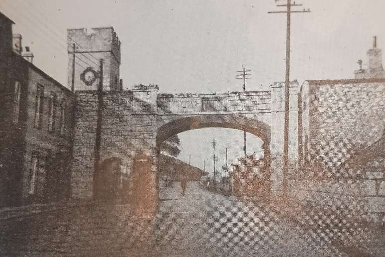 The bridge carrying the railway from the quarries to the harbour over the Antrim Coast Road (Harbour Road) through Carnlough. The view looks North through the bridge, © J. H. McGuigan. [1: p793]
