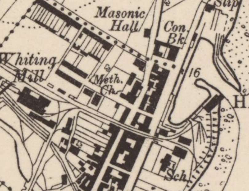 Carnlough Harbour as it appears on the 6″ Ordnance Survey of 1903, published in 1906. Two bridges carried the railway over Harbour Road and High Street. [13]