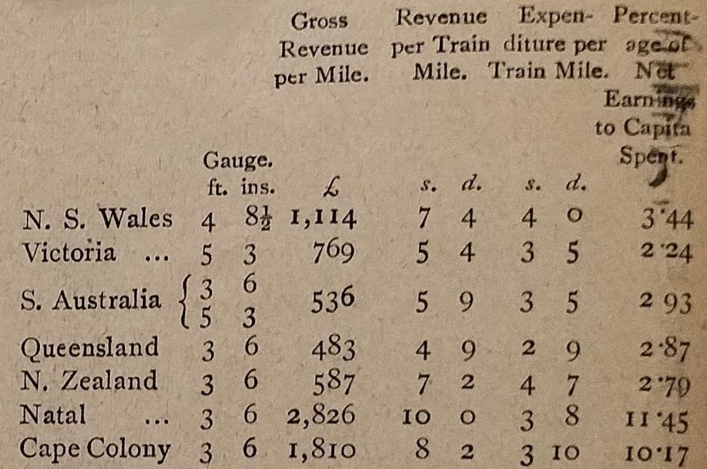 He accepts that “gross receipts per mile of railway and per head of population may not prove a very reliable criterion of the practical advan-tage of one gauge over another, and it can without doubt be contended that the wider gauges, having more powerful locomotives and a larger population settled alongside, can carry at a much cheaper rate, and thus the residents of New South Wales and Victoria should gain indirectly a counterpoise to the very apparent disadvantage of the greatly increased initial cost in those colonies.” [1: p423]